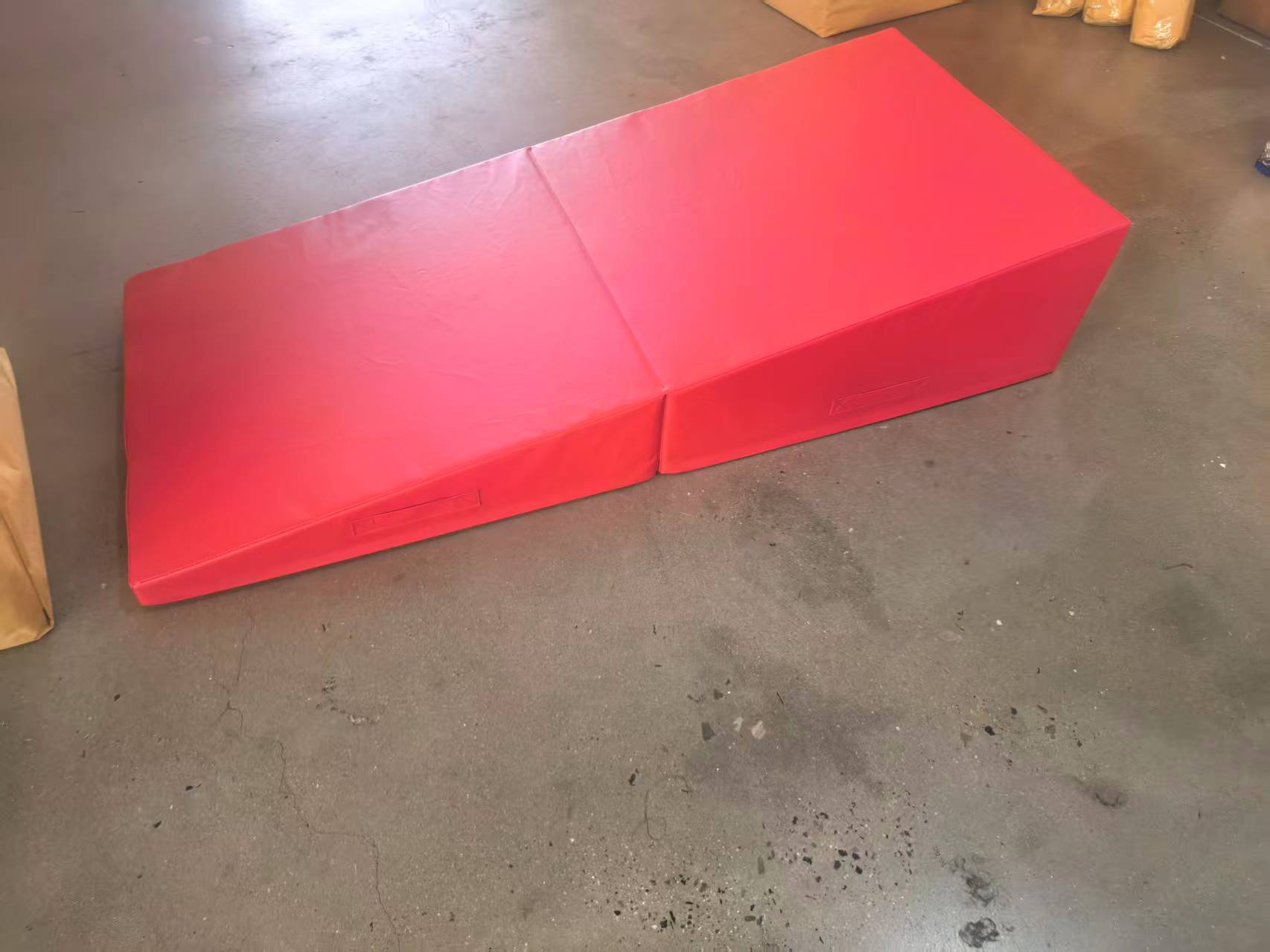 The gymnastics triangle floor mat’s size is 940mm*585mm*355mm or customized, material : High grad sponge / EPE + Leather, It advance international heat binding technology,which is durable and flexible.